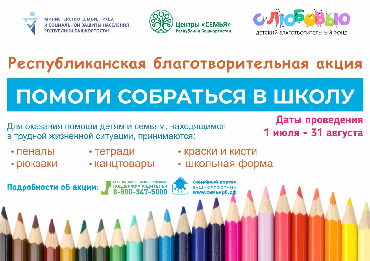 Вот уже в 12-й раз в нашем регионе проходит благотворительная акция «Помоги собраться в школу», организованная Министерством семьи, труда и социальной защиты населения РБ и Центрами «Семья».